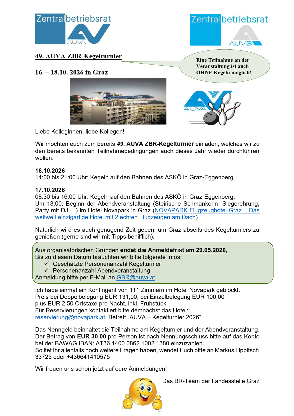die BR-Landesstelle Graz lädt zum 49. AUVA ZBR-Kegelturnier ein.