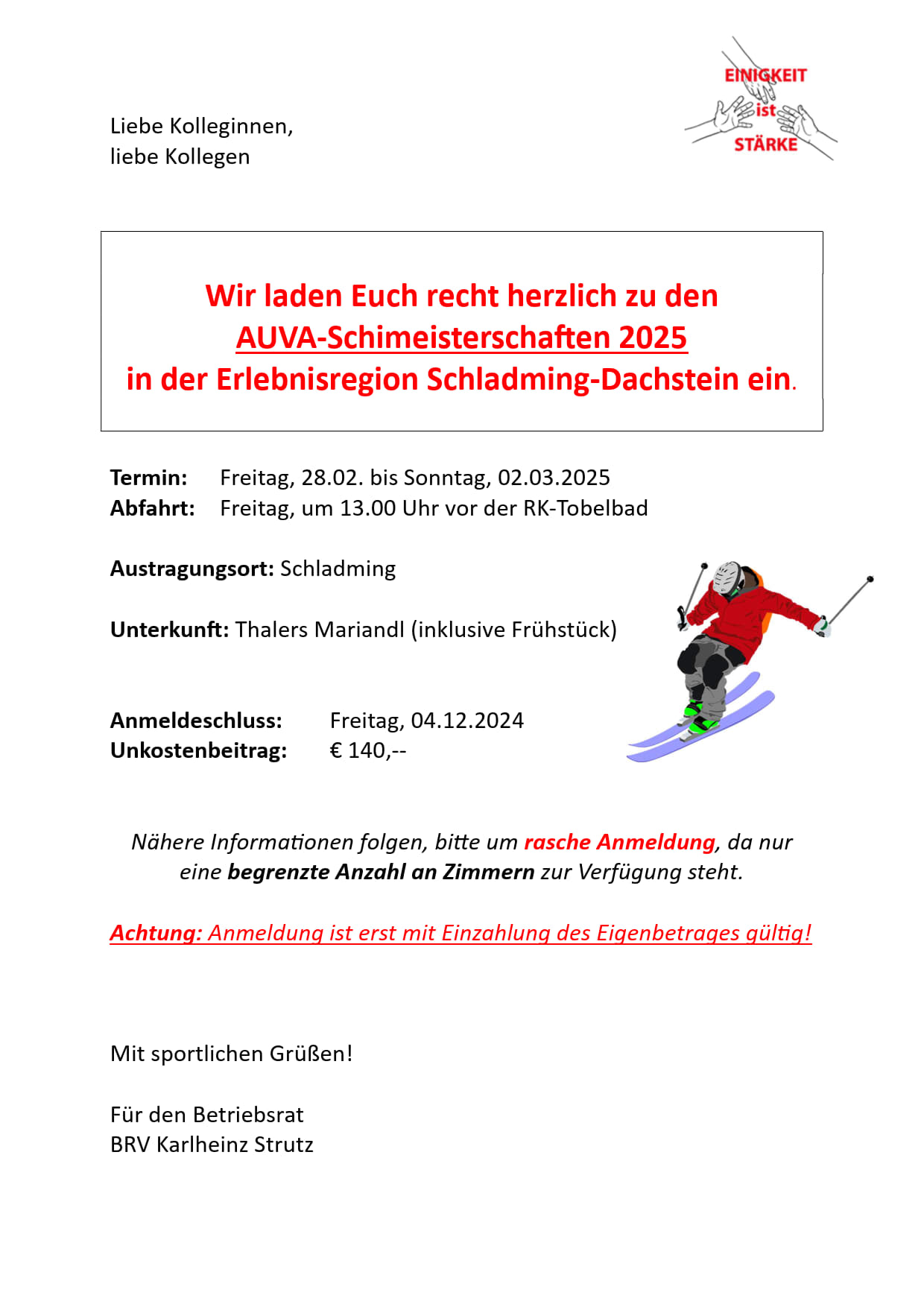 Bitte so rasch als möglich für die ZBR AUVA-Schimeisterschaften anmelden! Diese finden heuer das 1. Mal in der Erlebnisregion Schladming-Dachstein statt. Anmeldungen sind erst mit Einzahlung des Unkostenbeitrages gültig!