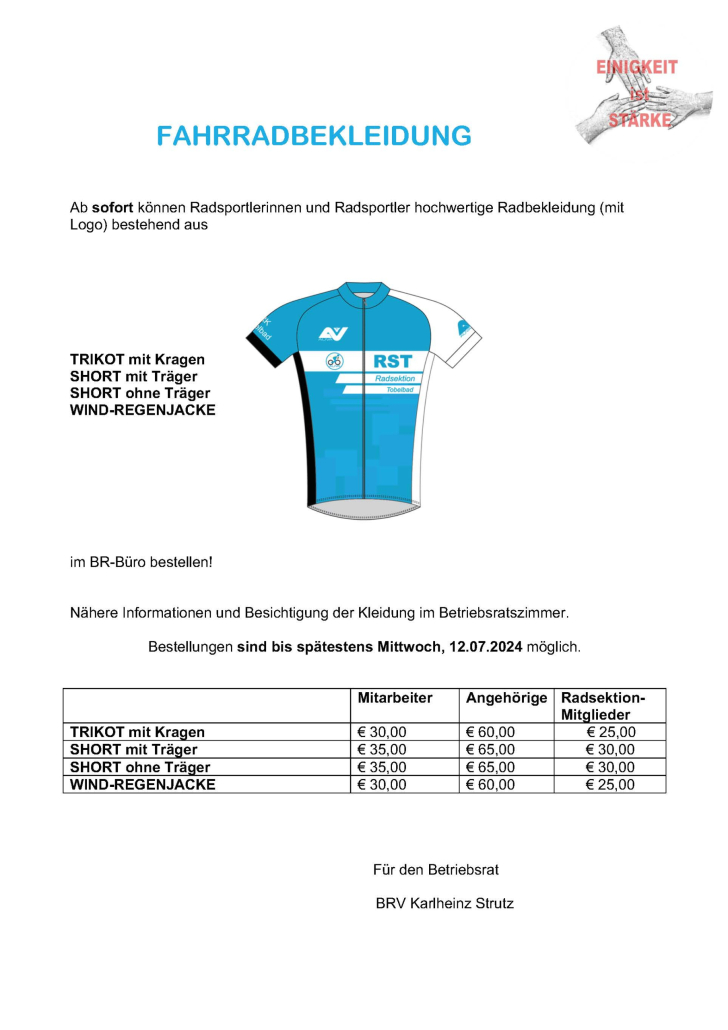 ab sofort können Radsportlerinnen und Radsportler hochwertige Radbekleidung (mit Logo) bestellen.