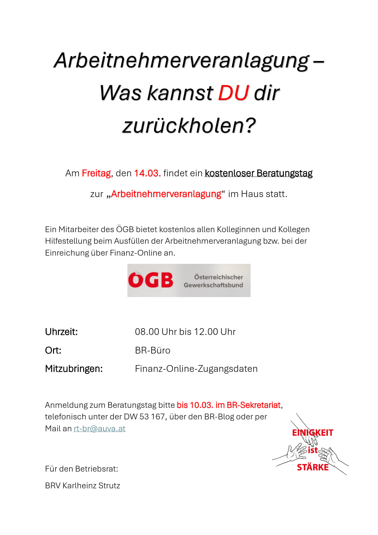am Freitag, den 14. März bieten wir euch die Möglichkeit, ein Beratungsgespräch betreffend Arbeitnehmerveranlagung in Anspruch zu nehmen. Bitte bei Bedarf einen Termin im BR-Sekretariat vereinbaren.