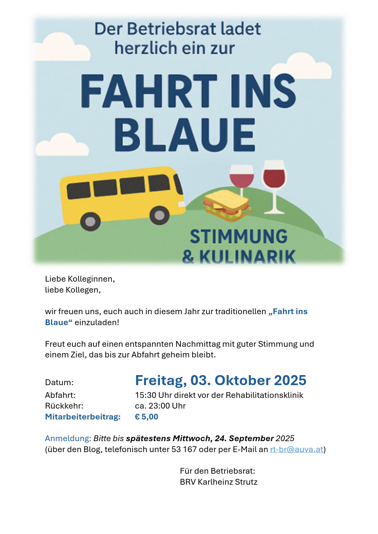Lasst euch überraschen, am Freitag, den 03. Oktober 2025 findet unsere „Fahrt ins Blaue “ statt!
