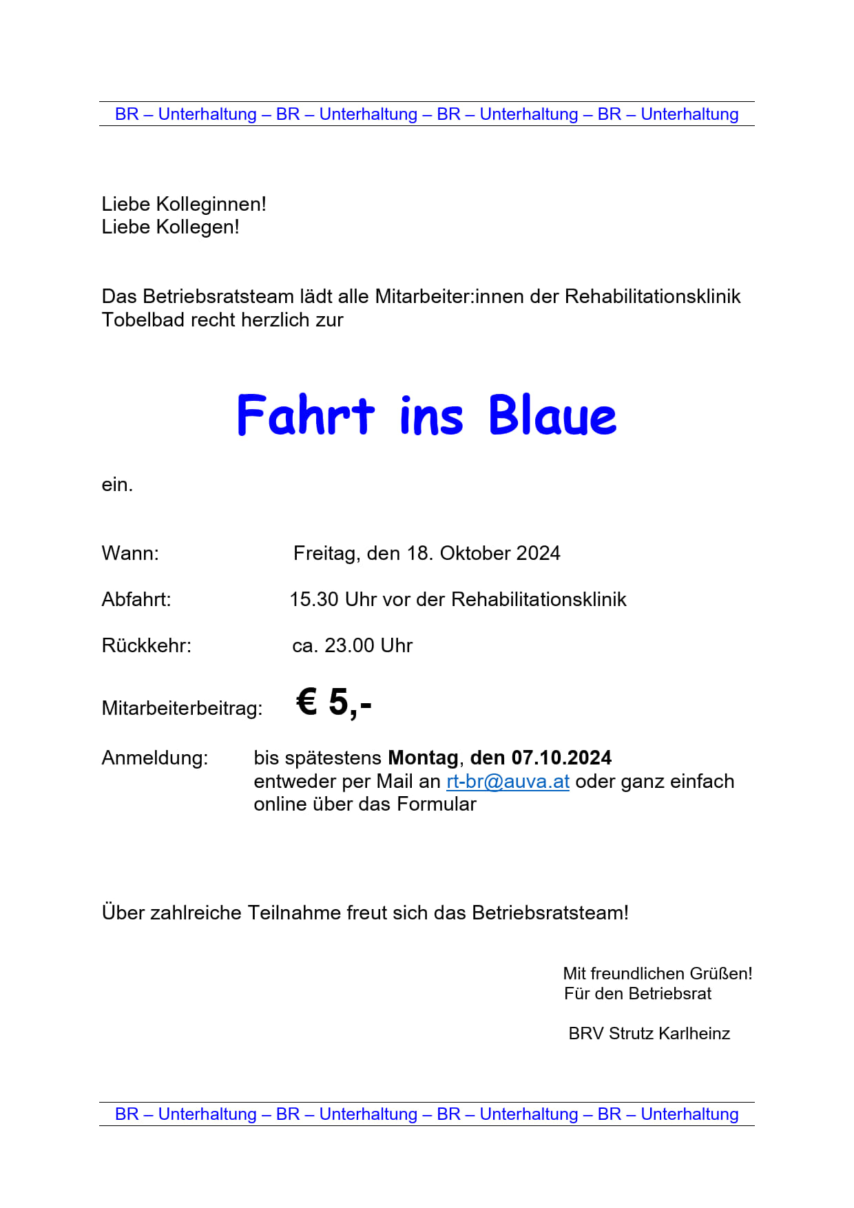 Der Ausflug wird am 18.10.2024 stattfinden, bitte um Anmeldung bis spätestens Montag, 07.10.2024.