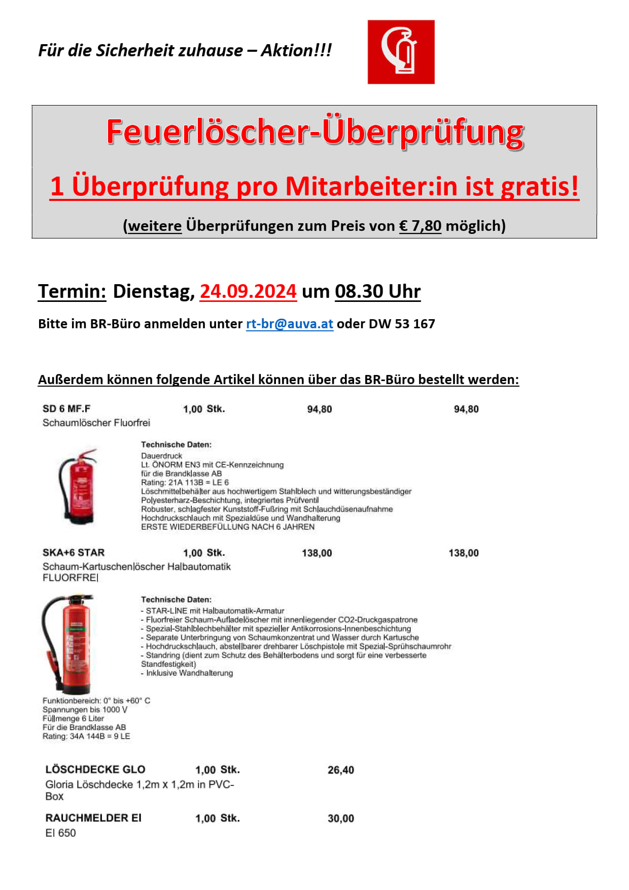 Am Dienstag, den 24.09.2024 kommt die Firma Weinrauch zu uns ins Haus, um eine Feuerlöscher-Überprüfung durchzuführen. 1 Überprüfung pro Mitarbeiter:in ist gratis.