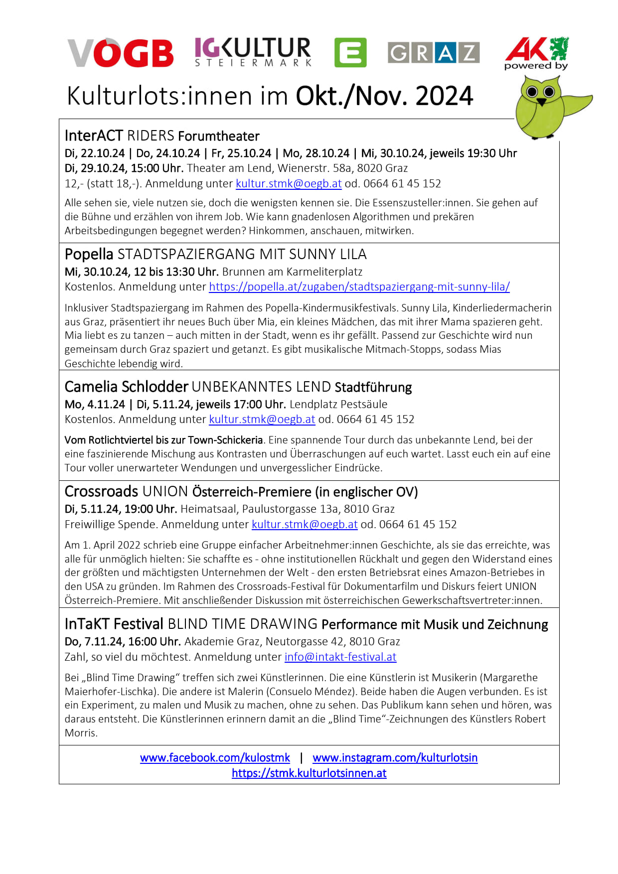 Alle Infos zur steirischen Kulturinitiative für Oktober/November 2024 findet ihr im Anhang.