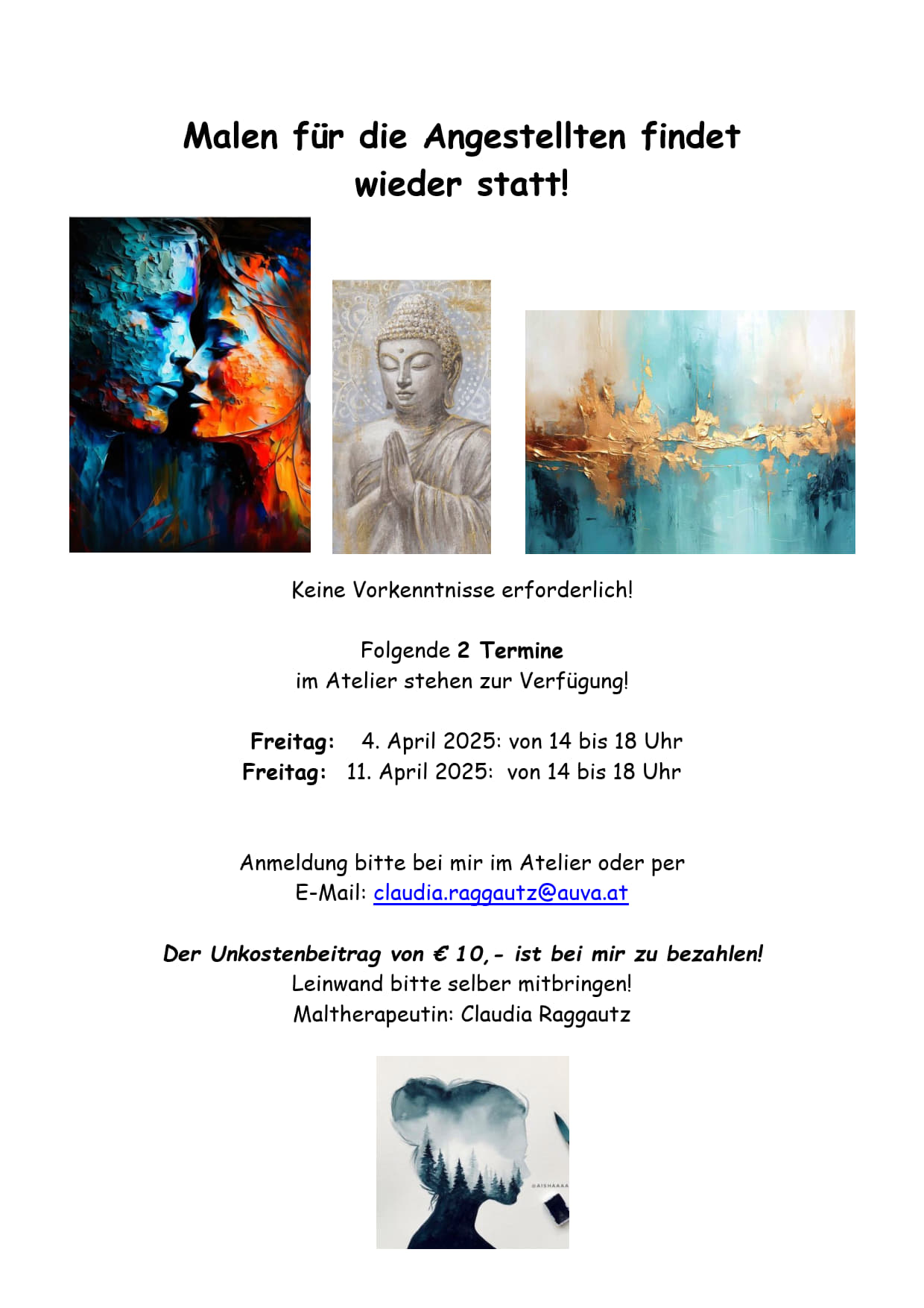Ab sofort können sich Mitarbeiter:innen wieder für einen Malkurs bei Frau Claudia Raggautz im Atelier (E.28) anmelden!