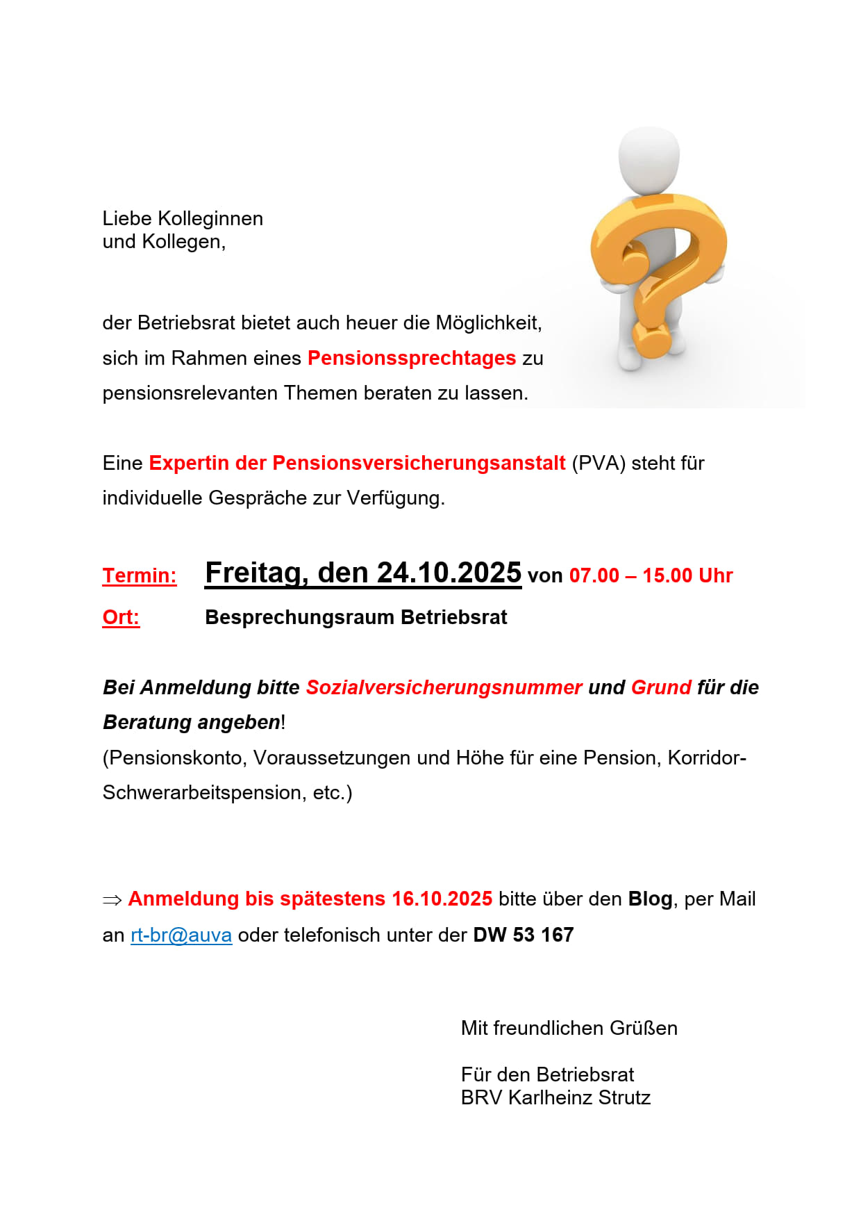 Am Freitag, den 24.10.2025, findet im Haus wieder ein Pensionssprechtag für Mitarbeiter:innen statt, Terminvereinbarung bitte im BR-Sekretariat
