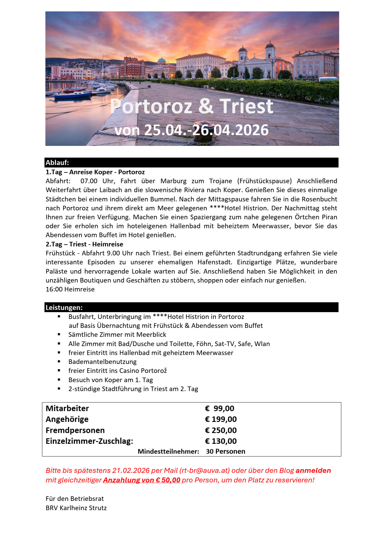 Unsere Frühlingsfahrt führt uns vom 25. bis 26. April 2026 an die sonnige Adriaküste nach Portorož und Triest. Genießt mit uns die ersten warmen Tage des Jahres, entdeckt mediterranes Flair und stimmt euch gemeinsam auf den Sommer ein.