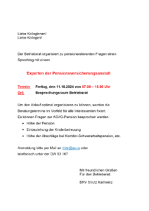 der PVA-Sprechtag für Mitarbeiter:innen wird am Freitag, 11.10.2024 von 07.00 Uhr bis 15.00 Uhr im Besprechungsraum des Betriebsrates stattfinden. Bitte bei Bedarf einen Beratungstermin vereinbaren.