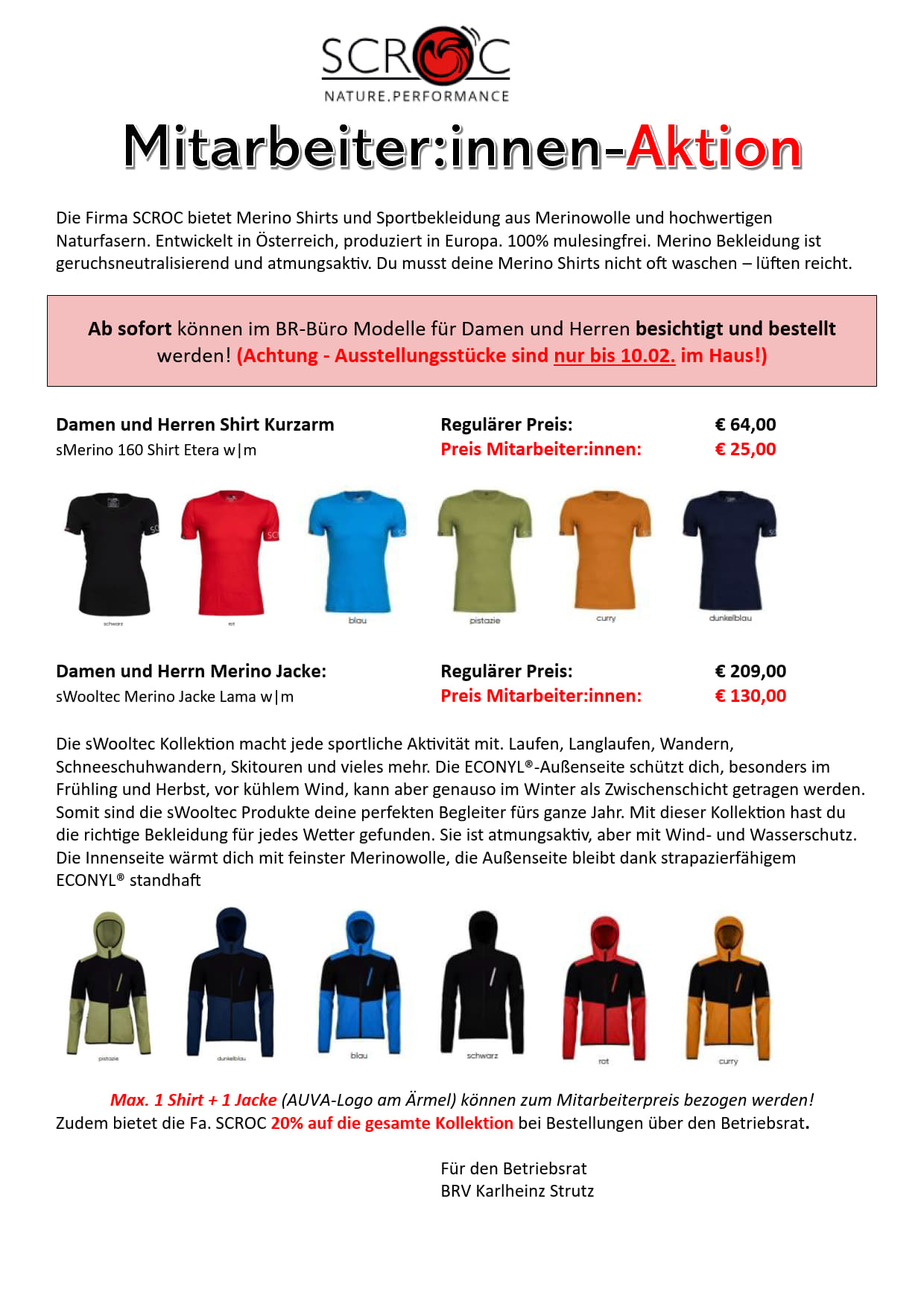 Auch heuer gibt es wieder eine tolle Aktion der Firma SCROC: Pro Mitarbeiter:in können 1 Shirt + 1 Jacke zum vergünstigten Preis bezogen werden. Die Kollektion liegt im BR‑Büro bis 10.02. für euch bereit und kann jederzeit besichtigt und bestellt werden.