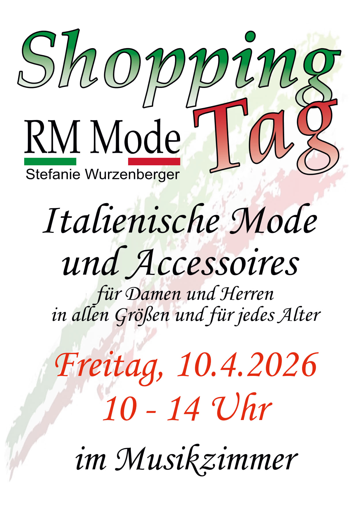 Am Freitag, den 10.04.2026 findet wieder eine Verkaufsveranstaltung der Firma RM-Mode statt, tolle italienische Bekleidung und Accessoires werden angeboten! Mitarbeiter:innen erhalten 20 % auf die Kollektion!
