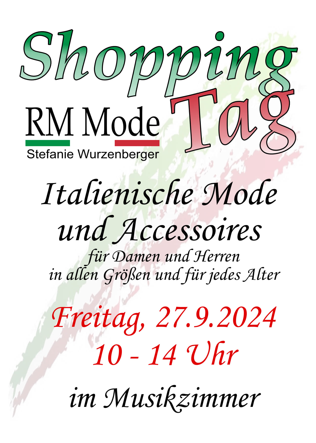 Am Freitag, den 27.09., findet wieder eine Verkaufsveranstaltung der Firma RM-Mode statt, tolle italienische Bekleidung und Accessoires werden angeboten!