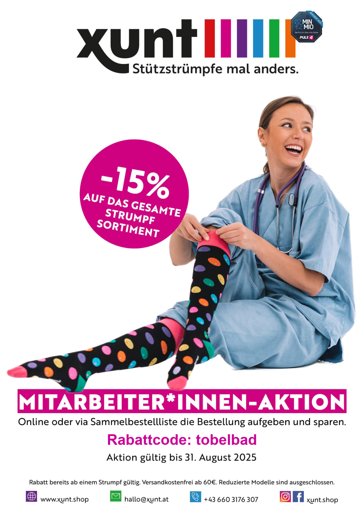 Bei Interesse im Onlineshop unter www.xunt.shop mit dem Rabattcode: tobelbad bestellen. Es gibt 15 % Rabatt auf das gesamte Sortiment an Stütz- und Sportstrümpfen!